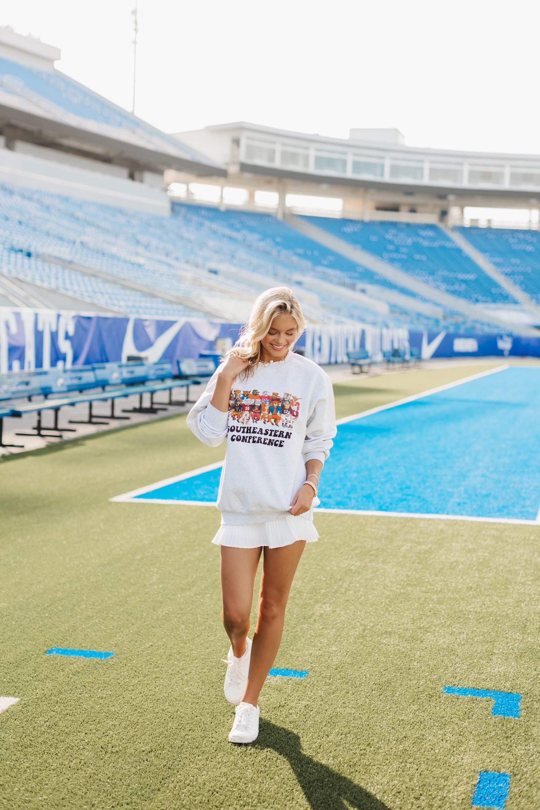 Welcome to the SEC! Our iconic SEC Family Sweatshirt just got better! We added in Texas and Oklahoma! This graphic was custom painted for Charlie Southern by Don Collins, a talented artist from Arlington, TX. Unique from any piece we've done before, this one features a colorful, hand painted graphic of all of the SEC mascots with a retro font on a throwback thick Hanes sweatshirt!